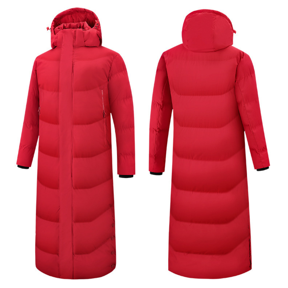 Ta czerwona długa kurtka puchowa dla pań jest idealna na zimną pogodę, ponieważ zapewnia ciepło i ma kaptur.