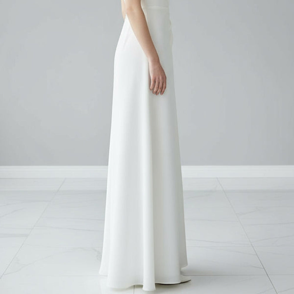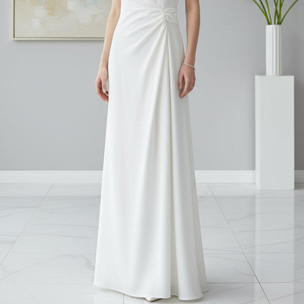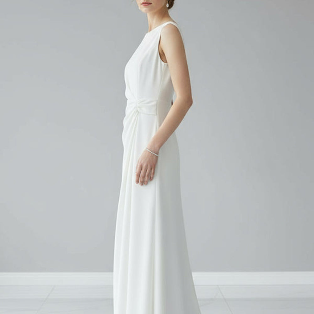 Formalna suknia ślubna maxi o gładkim kroju i delikatnym plisowaniu zapewnia elegancki wygląd na wieczorne wydarzenia, bankiety i uroczystości. Lekki materiał, okrągły dekolt i bezrękawnik podkreślają sylwetkę, dając swobodę ruchu i ponadczasowy styl.