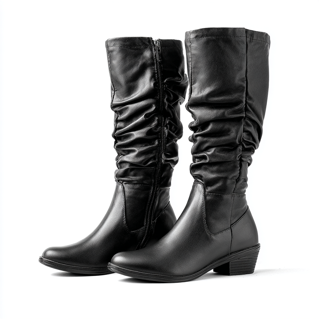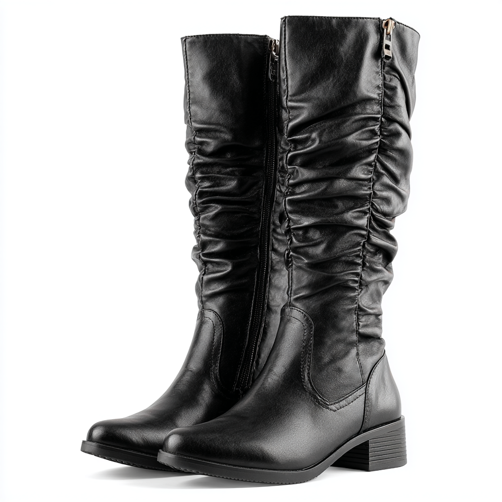 Te damskie kozaki za kolano łączą elegancję z wygodą, tworząc idealny wybór na jesień i zimę. Luźna cholewka i niski, stabilny obcas sprawiają, że buty świetnie pasują do sukienek, spódnic, legginsów i obcisłych jeansów. Wykonane z miękkiej ekoskóry lub materiału przypominającego zamsz, zapewniają komfort i styl podczas codziennych stylizacji.