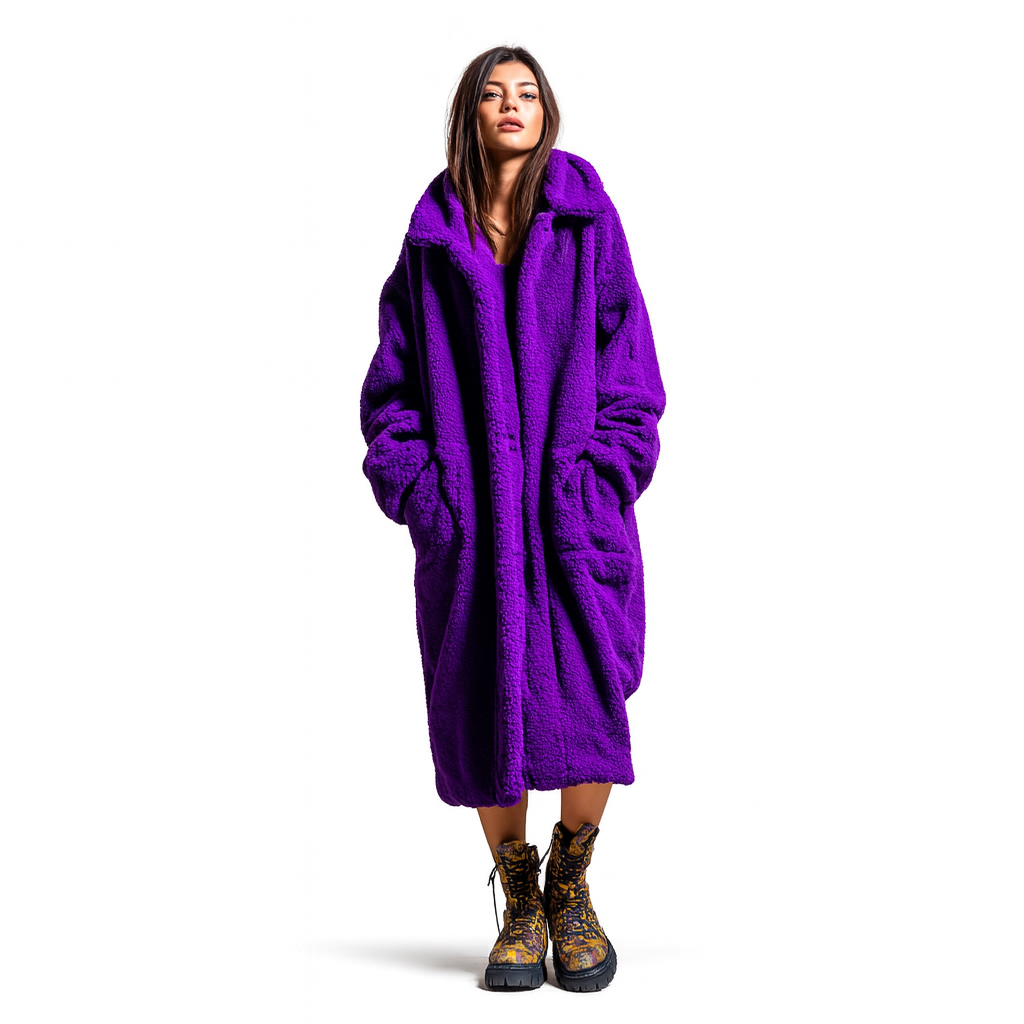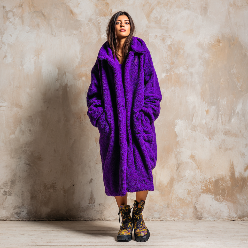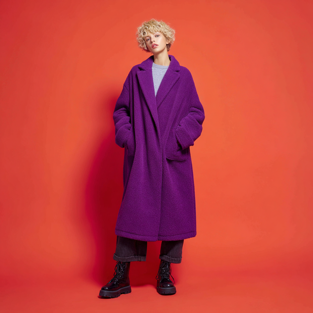 Ten fioletowy płaszcz zimowy oversize łączy nowoczesny styl ze swobodnym komfortem, tworząc idealny element zimowej garderoby. Luźny krój sprawia, że płaszcz świetnie układa się na swetrach, sukienkach i codziennych stylizacjach, a głęboki odcień fioletu dodaje charakteru i elegancji. Miękka tkanina i przyjemna podszewka zapewniają ciepło podczas chłodnych dni, tworząc stylowy i wygodny zimowy look.