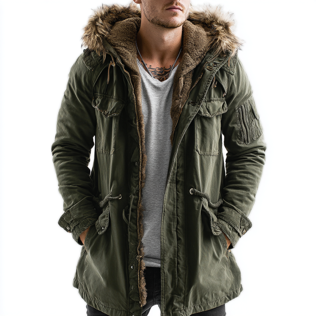 Ta męska parka zimowa została zaprojektowana tak, aby zapewnić skuteczną ochronę przed surową zimą. Gruba izolacja oraz miękki kaptur wykończony futrem gwarantują ciepło nawet podczas silnego mrozu. Inspiracja stylem wojskowym nadaje jej mocny charakter, łącząc wytrzymałość z komfortem potrzebnym podczas codziennych zimowych aktywności.